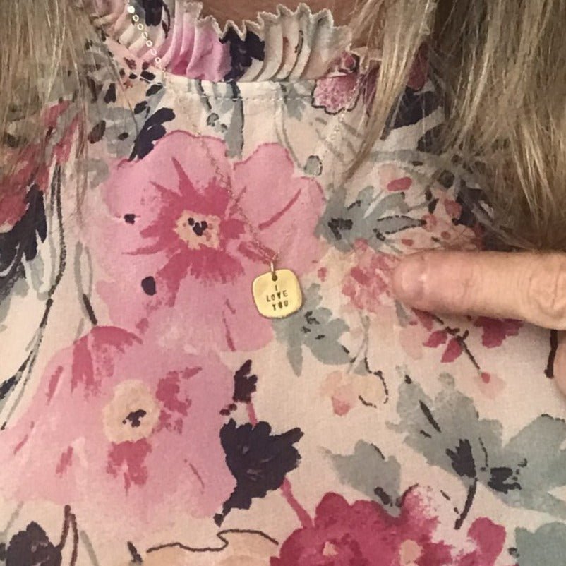 Love, love love. Remind someone how much you love them with this simple heartwarming necklace, "I love you" is handstamped on a square pendant. Available in recycled sterling silver or 14kt gold vermeil.