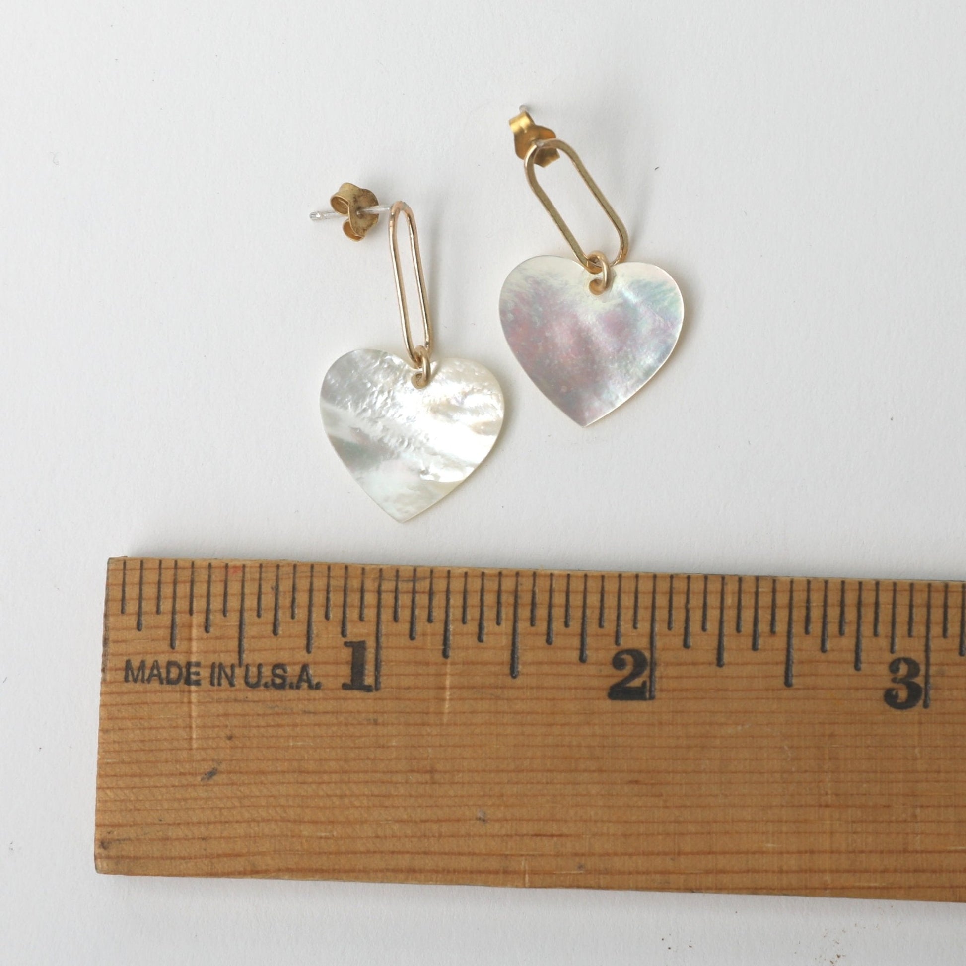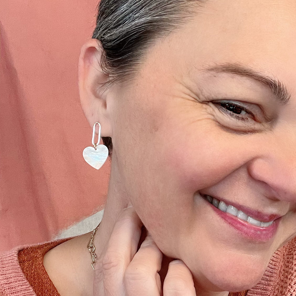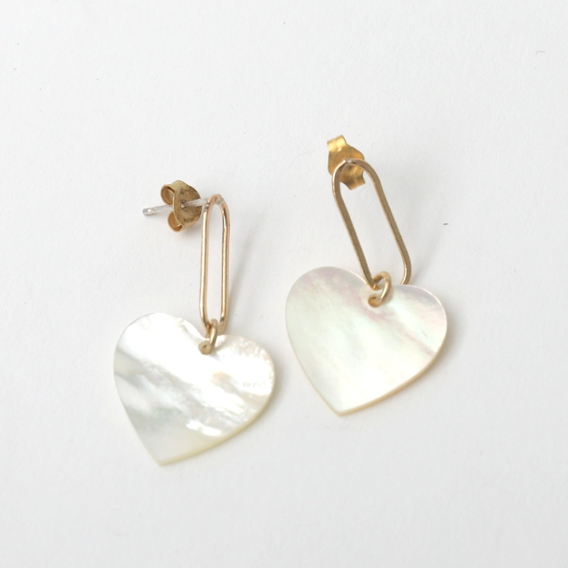 These earrings feature a carved heart made of Mother of Pearl hung on a paper clip link. Your choice of sterling silver metal or 14kt gold fill.