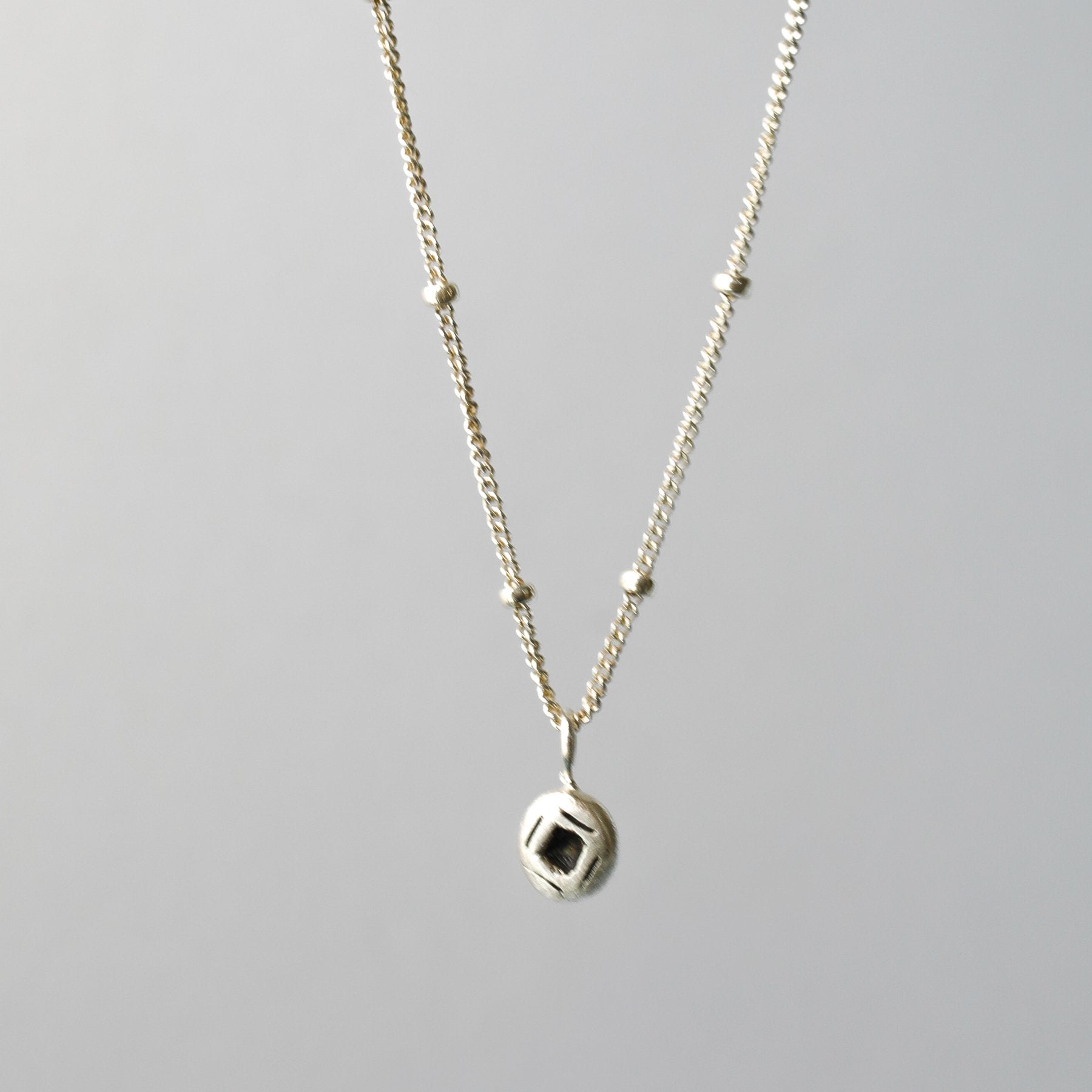 The tiniest abstract labyrinth charm necklace features a hand sculpted charm out of recycled sterling silver and is hung on a satellite chain.