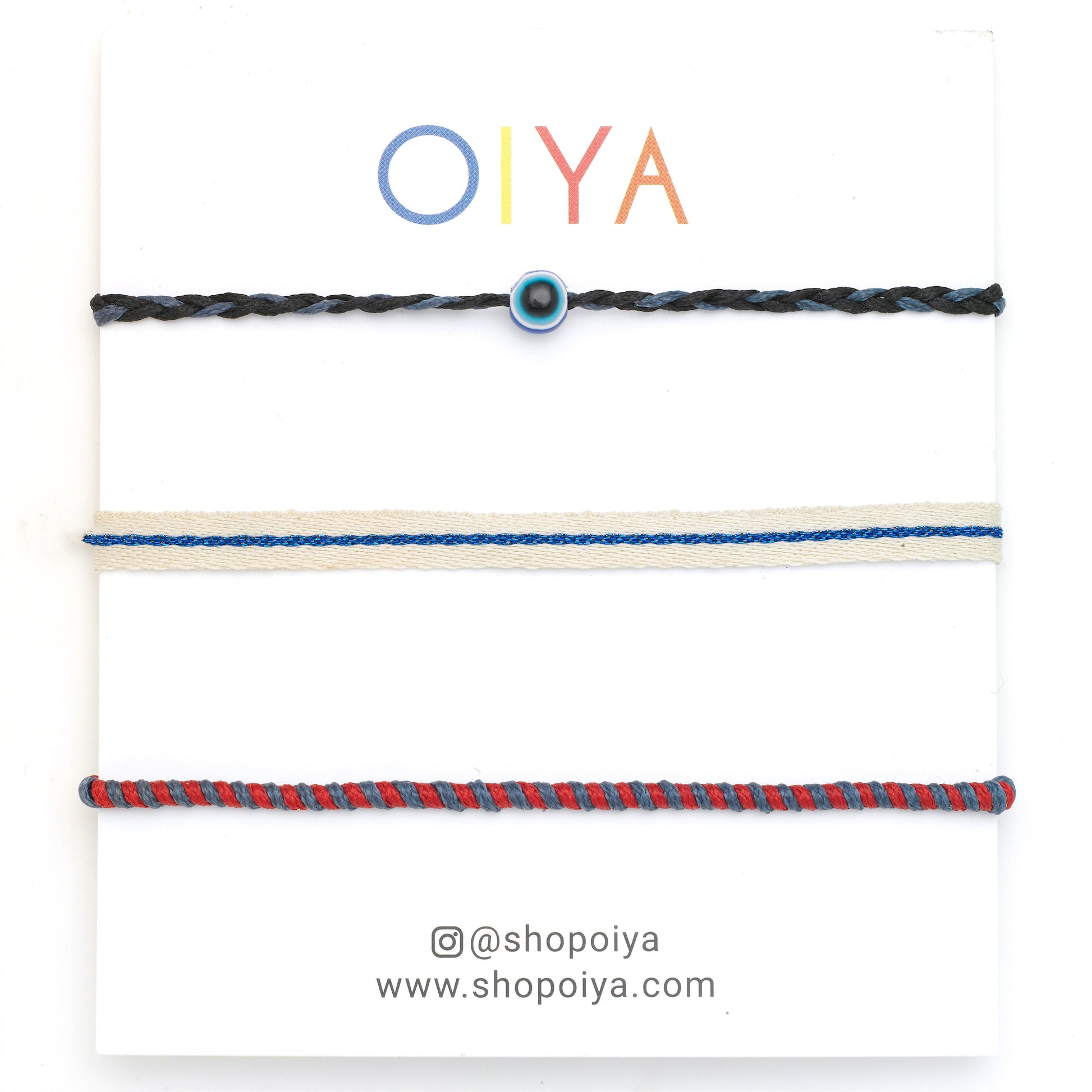 twisted duo colored bracelet, and a black wax-coated bracelet with a small evil eye bead.
