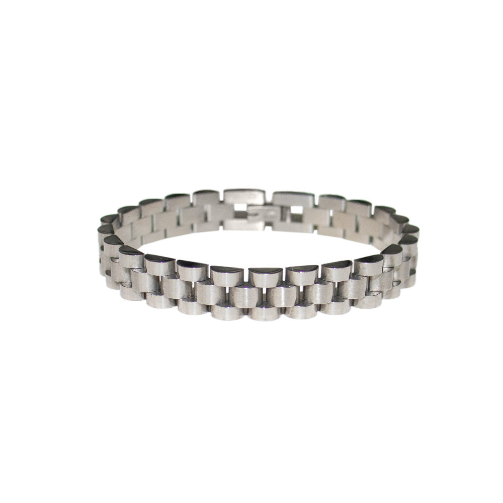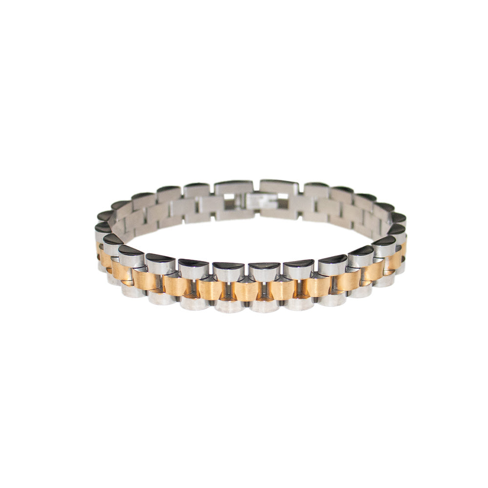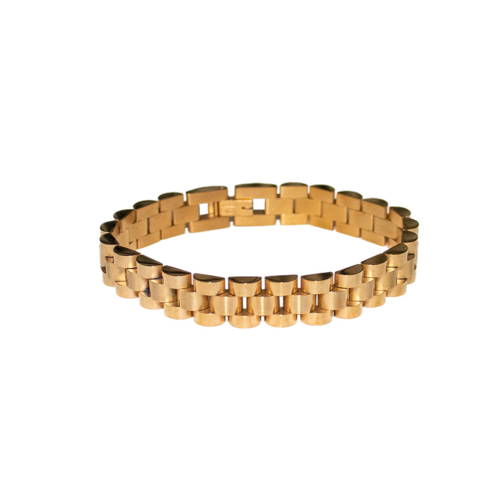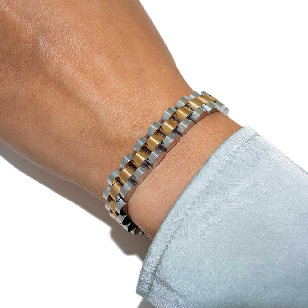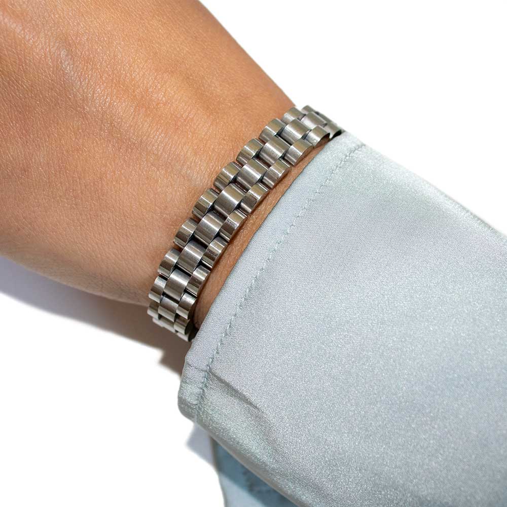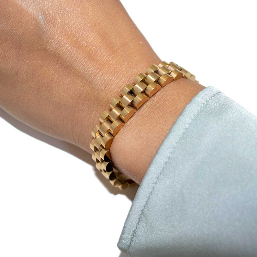 The Olivia bracelet features a three-link watch band strap that takes inspiration from a traditional timepiece. This versatile statement piece that can be worn with any outfit and looks great paired with our matching Olivia Watch Strap Ring!